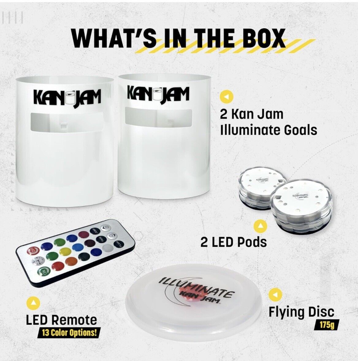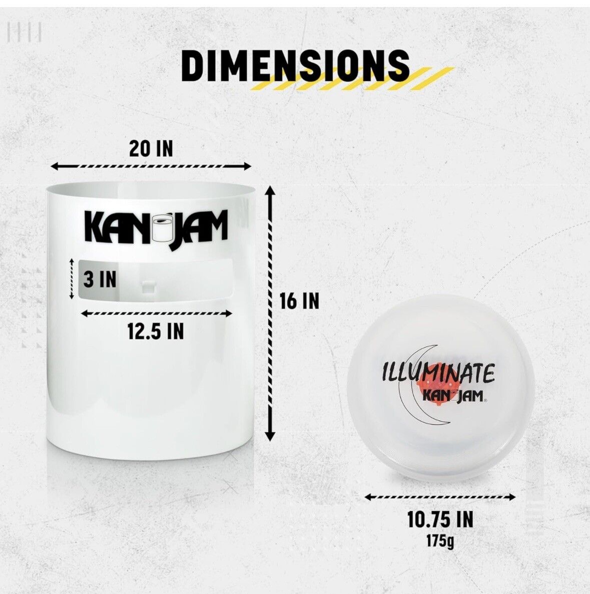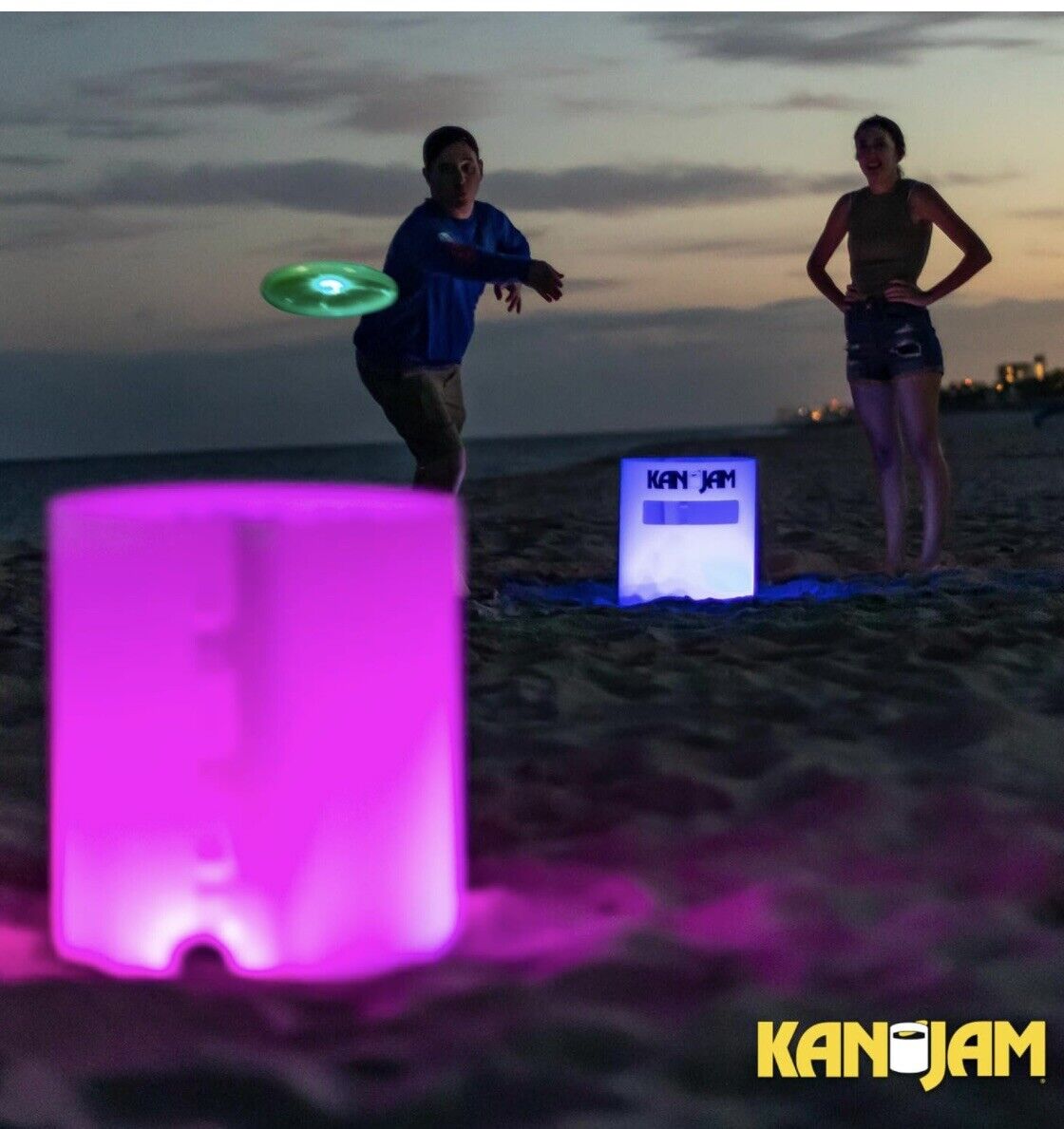 Mit dem **KanJam Illuminate Glow Game** kannst du jederzeit weiterspielen – egal, wie spät es ist. Das Spiel enthält zwei lichtreaktive Tore und eine im Dunkeln leuchtende Wurfscheibe. Wähle die Farbe jedes Tors mit dem zugehörigen LED-Lichtmodul mit 9 Farben. Entwickelt für Kinder ab 8 Jahren, ist dieses Spiel für vier Personen geeignet, erfordert keinen Aufbau und ist in wenigen Minuten einsatzbereit. Spiele tagsüber oder warte bis zur völligen Dunkelheit, um das volle Potenzial dieses Spiels zu erleben.